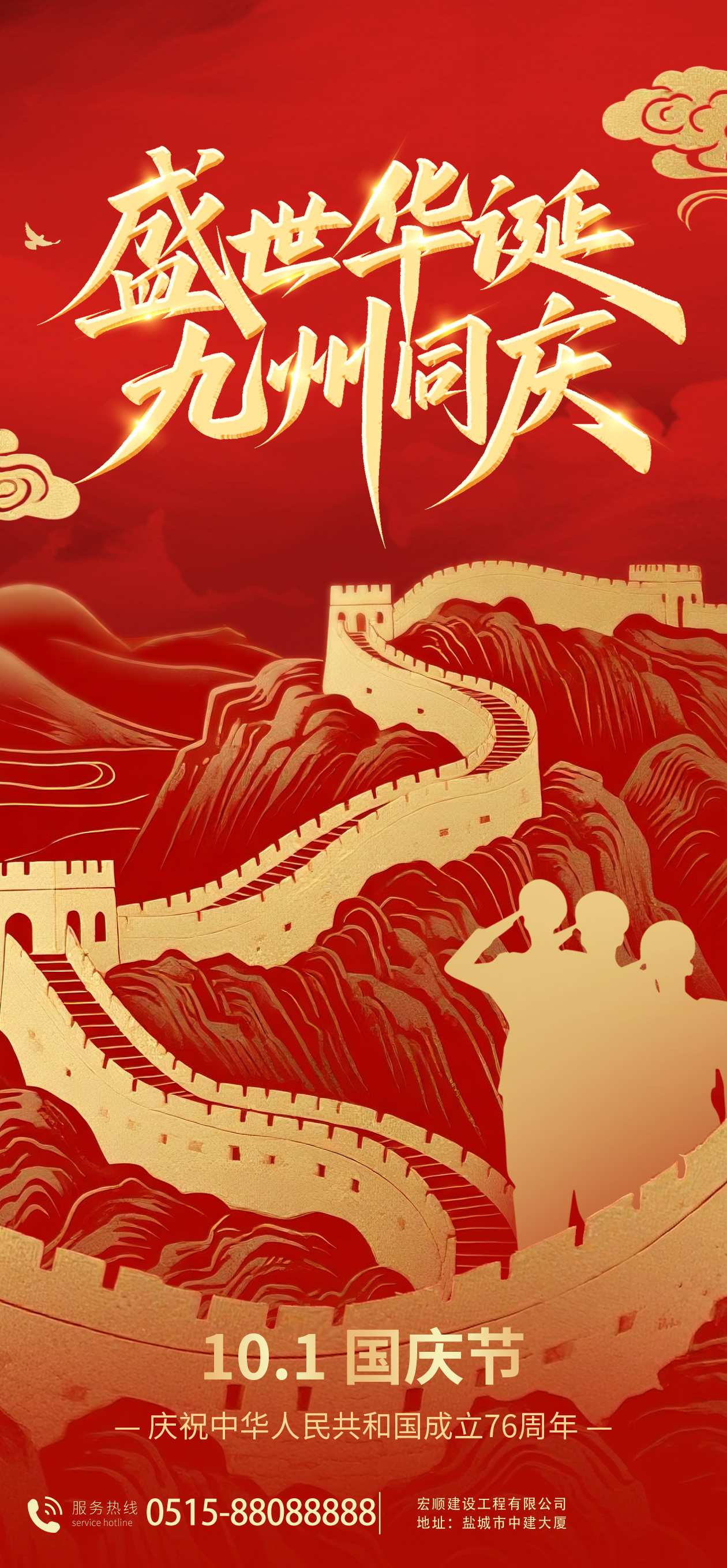 作為城市建設的筑夢者,我們深知每一棟拔地而起的高樓都凝聚著建設者的汗水,每一條延伸向遠方的道路都承載著時代的夢想。在這個特殊的日子里,我們不僅要為祖國的輝煌成就感到自豪,更要為能參與國家建設而感到無比光榮。國慶長假將至,愿各位在享受美好假期的同時,也能感受到我們最真摯的祝福。無論是與家人團聚的天倫之樂,還是外出游歷的愜意時光,都愿您收獲滿滿的幸福與歡樂。讓我們暫別繁忙的工作,在秋日的暖陽中積蓄力量,以更飽滿的熱情迎接未來的挑戰。宏順建設將始終秉持"質量為本、誠信立業"的企業精神,與您攜手共創美好明天。